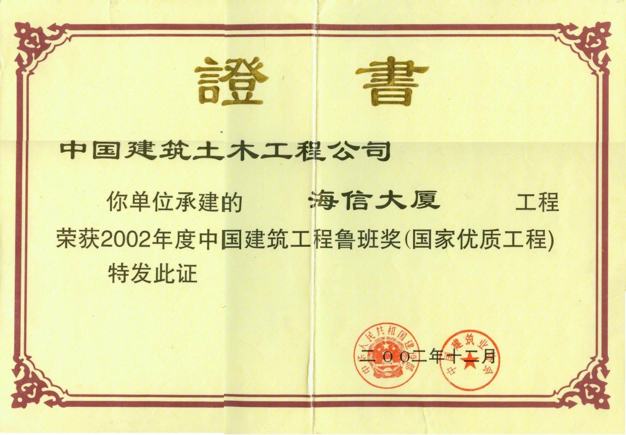青岛海信大厦荣获2002年度鲁班奖,工程位于青岛市市南区东海西路,是海信集团总部所在地,由海信集团投资兴建,青岛万通建设监理有限责任公司监理,中建八局第四建设有限公司施工。该工程占地7600平方米,为框剪结构,地下两层,地上25层,建筑高度93.5米,建筑面积约44653平方米。工程于1998年10月28日开工,2000年6月28日竣工。
